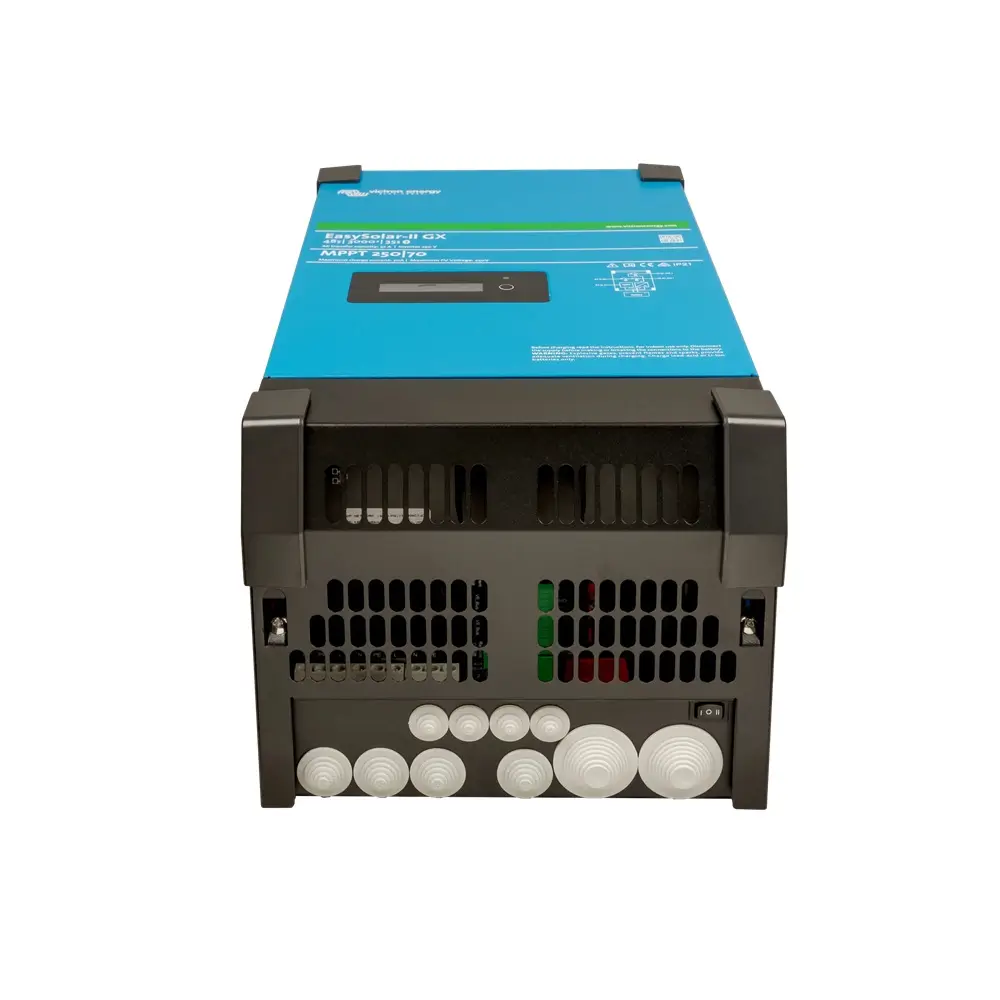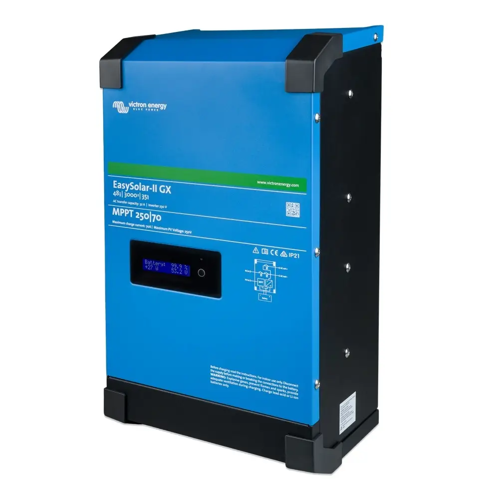 Το Victron Energy EASYSOLAR-II 48/3000/35-32 MPPT 250/70 GX αποτελεί μια ολοκληρωμένη λύση ενέργειας για αυτόνομα φωτοβολταϊκά και υβριδικά συστήματα. Σχεδιασμένο για χρήση σε κατοικίες, επαγγελματικούς χώρους και off-grid εγκαταστάσεις, το EASYSOLAR-II ενσωματώνει inverter/φορτιστη, MPPT ελεγκτή ηλιακής ενέργειας και σύστημα διαχείρισης ενέργειας σε μία συμπαγή και αξιόπιστη μονάδα.